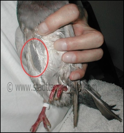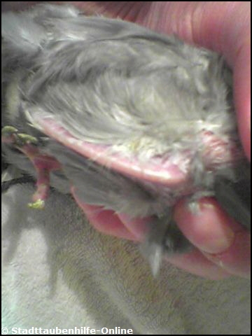 Im ausgehungerten Zustand hat die Taube so viel Substanz verloren, dass das Brustbein entsprechend hervor sticht.