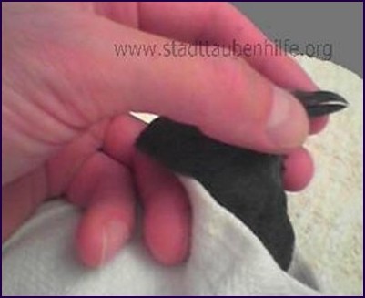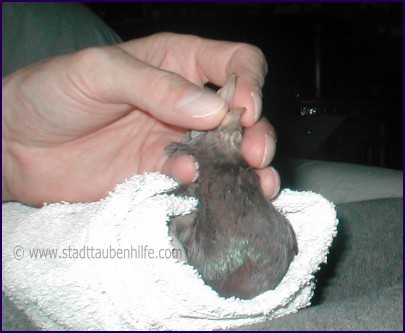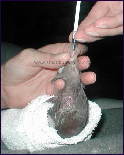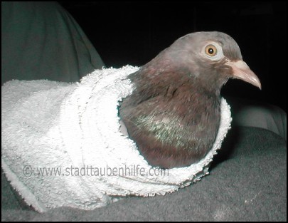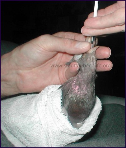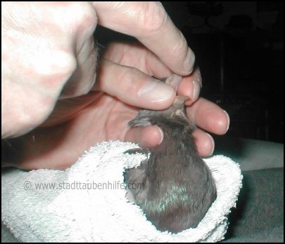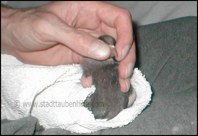Als Rechtshänder nimmt man die Taube auf dem Schoß in die linke Hand, wickelt sie je nach Mobilität in ein Handtuch, ...