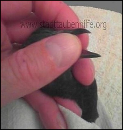 Das Öffnen des Schnabels mit der rechten Hand geschieht durch vorsichtiges(!) Anhebeln der überstehenden Schnabelspitze. (Meist steht der Oberschnabel über.)