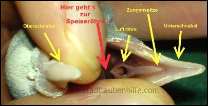 Dabei schiebt man am Oberschnabel entlang und nicht an der Zunge, denn am Ansatz der Zunge befindet sich die Luftröhre. (Aufbau des Schnabels siehe Bild ganz unten.)