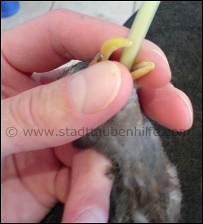 Dann das Vögelchen im Handtuch einwickeln, ihm sagen, dass es keine Angst haben braucht, den Schnabel anheben, damit es in der Kehle nicht so einen starken Knick gibt, und dann gaaanz vorsichtig die Sonde vorschieben, bis sie etwa 10 cm drin ist, gemessen ab Schnabelspitze bei erwachsener Taube.